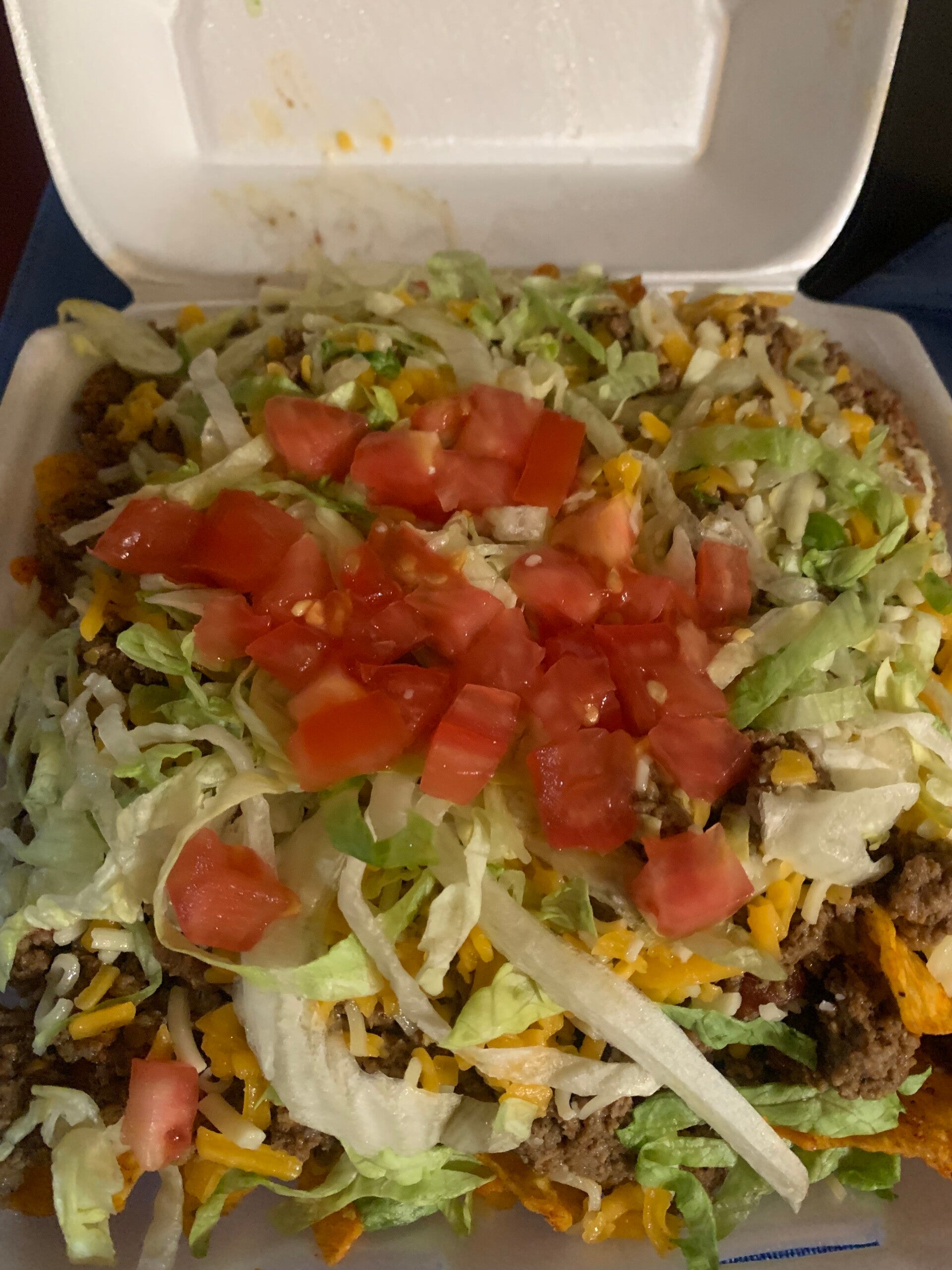 Full plate of tortilla chips topped with seasoned meat, cheese, lettuce, tomatoes and sour cream. Guacamole optional