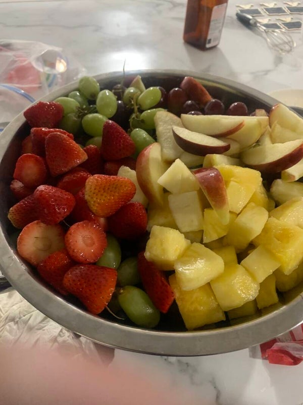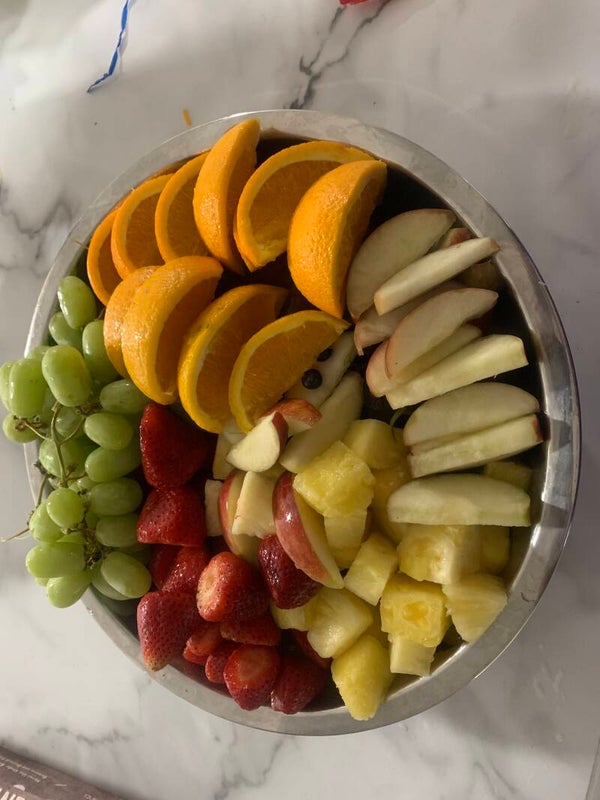 20 sliders each ham, turkey, and hamburger and seasonal fruit tray.